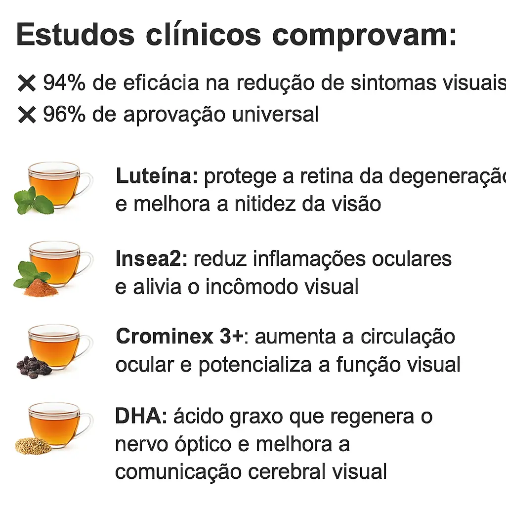 Os ativos naturais presentes nessa fórmula — como a Luteína, Insea 2 e Crominex 3+ — reduzem até 96% dos sintomas visuais relacionados ao glaucoma e à catarata, sem causar efeitos colaterais.
